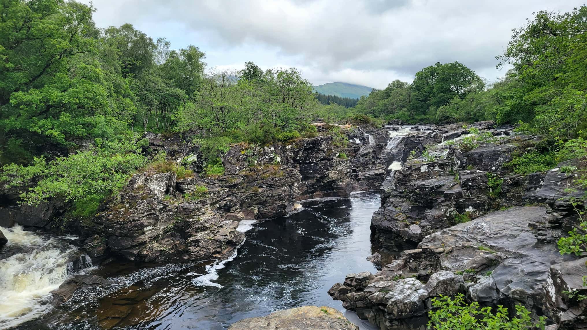 Les photos ne rendent clairement pas justice à la beauté du lieu. L’eau se fraye un chemin à travers les rochers moussus avant de plonger dans une vasque sombre, le tout entouré d’une végétation dense et sauvage. Un endroit encore peu fréquenté, brut, presque mystique, typiquement écossais. Typiquement DIana Gabaldon.