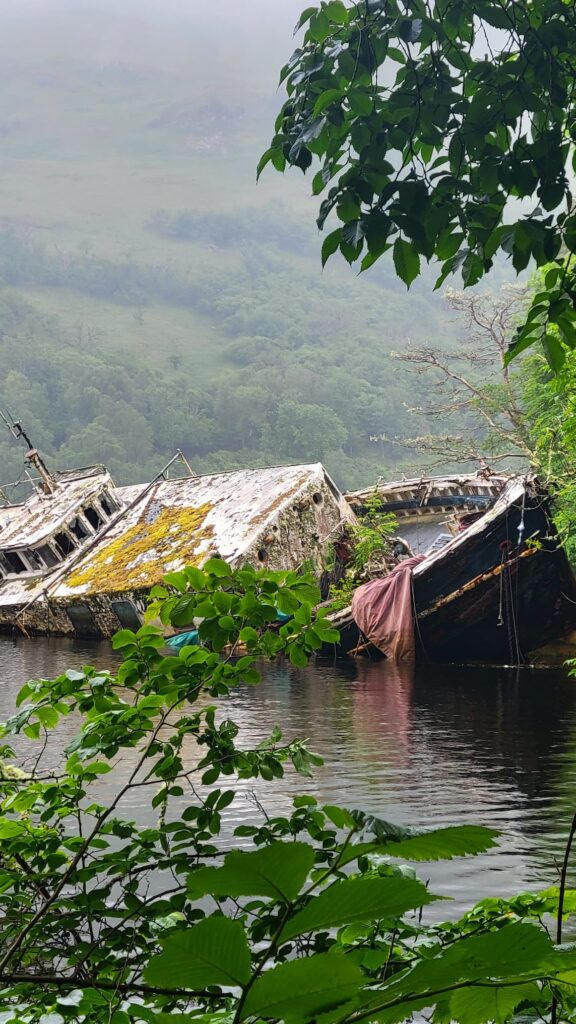Nous poursuivons avec un arrêt aux Invergarry Castle, des ruines datant du XVIIᵉ siècle, autrefois bastion du clan MacDonnell de Glengarry. Le château fut détruit après les rébellions jacobites, laissant derrière lui cette silhouette romantique et mélancolique. Juste à côté, une épave de bateau abandonnée renforce l’ambiance étrange du lieu, on se croirait clairement dans un jeu vidéo post-apocalyptique.