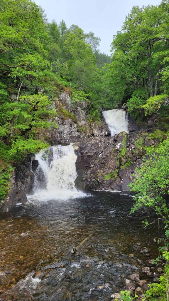 La journée commence par la découverte d’un véritable bijou de la nature : Eas Urchaidh, une superbe cascade nichée au cœur de la forêt, à seulement 5 minutes en voiture de notre cabane.