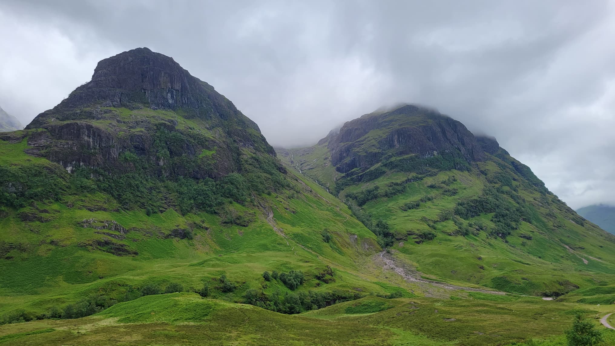 Nous découvrons l’un des panoramas les plus emblématiques de la région : Three Sisters of Glencoe, trois impressionnantes crêtes montagneuses formées par d’anciennes vallées glaciaires. Le décor est à couper le souffle : des parois vertigineuses, une route qui serpente au fond de la vallée et une atmosphère souvent changeante, entre lumière rasante et nuages bas.