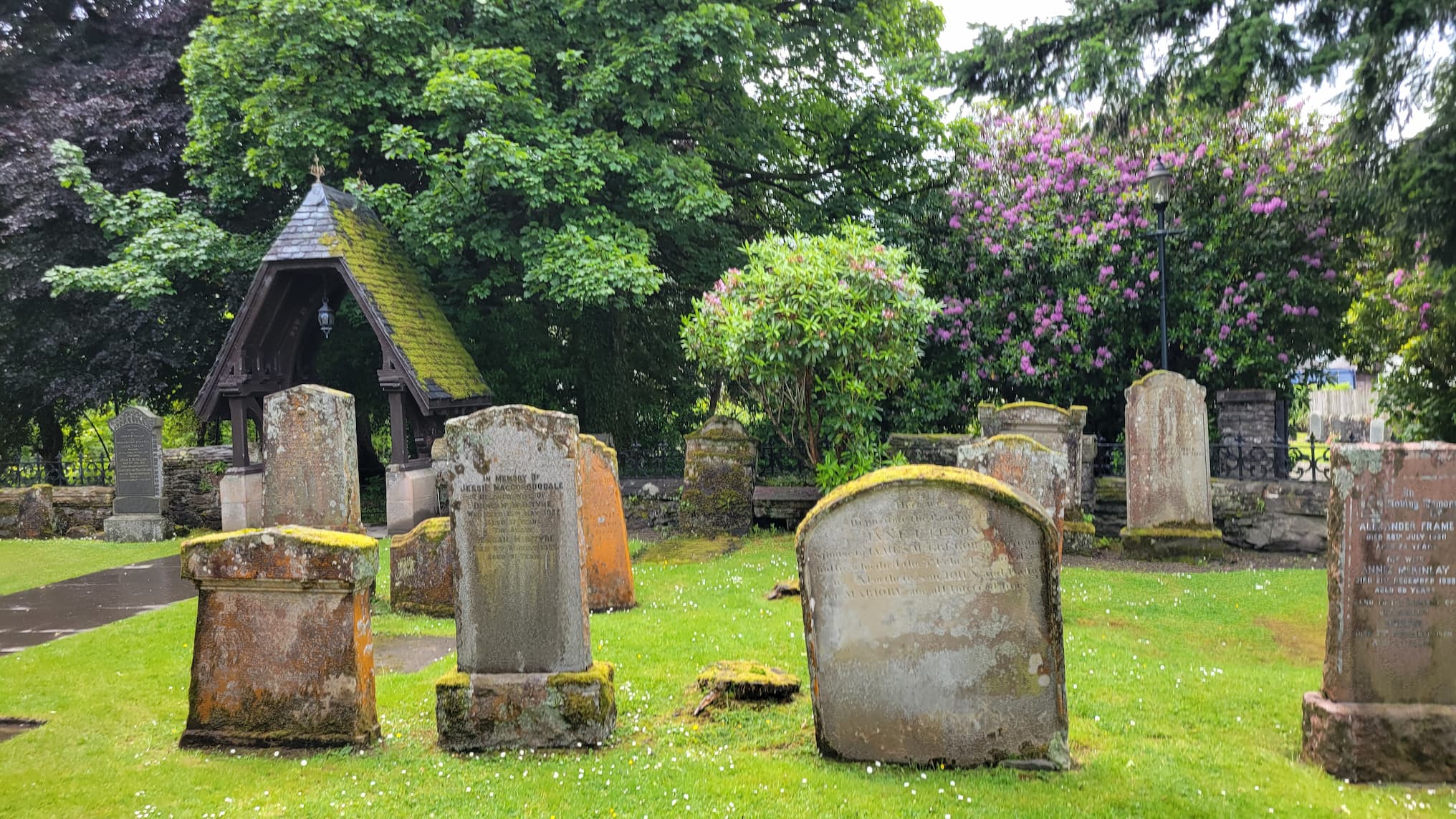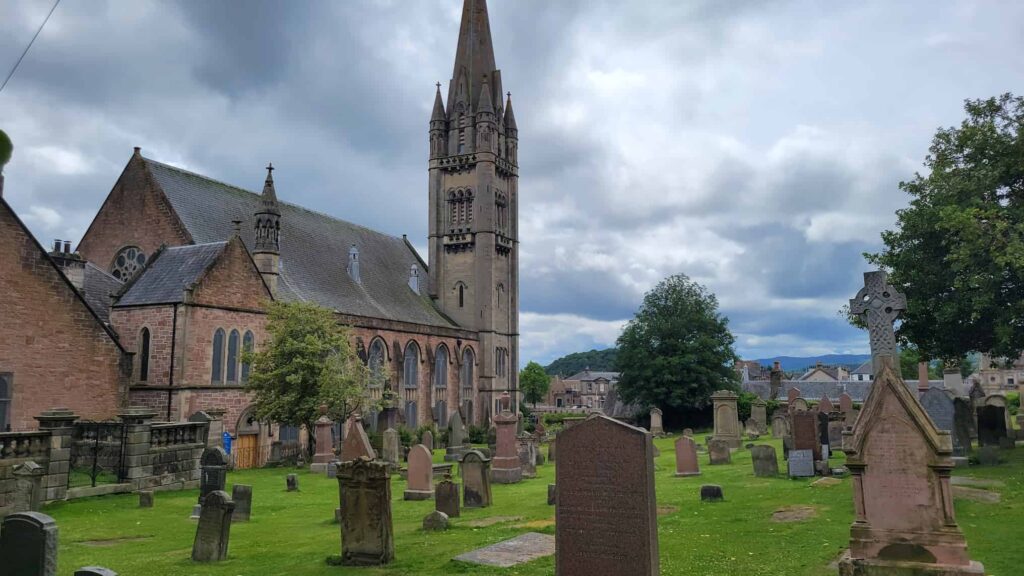 Nous reprenons ensuite la route vers le mythique Loch Lomond, le plus grand lac d’Écosse en superficie. Situé aux portes des Highlands, il marque la transition entre les Lowlands et les paysages plus sauvages du nord. Petit arrêt nature sous une météo capricieuse, on passe entre les gouttes, et belle surprise : la petite église de Luss, entourée d’un cimetière, dégageant une atmosphère incroyablement paisible et hors du temps.