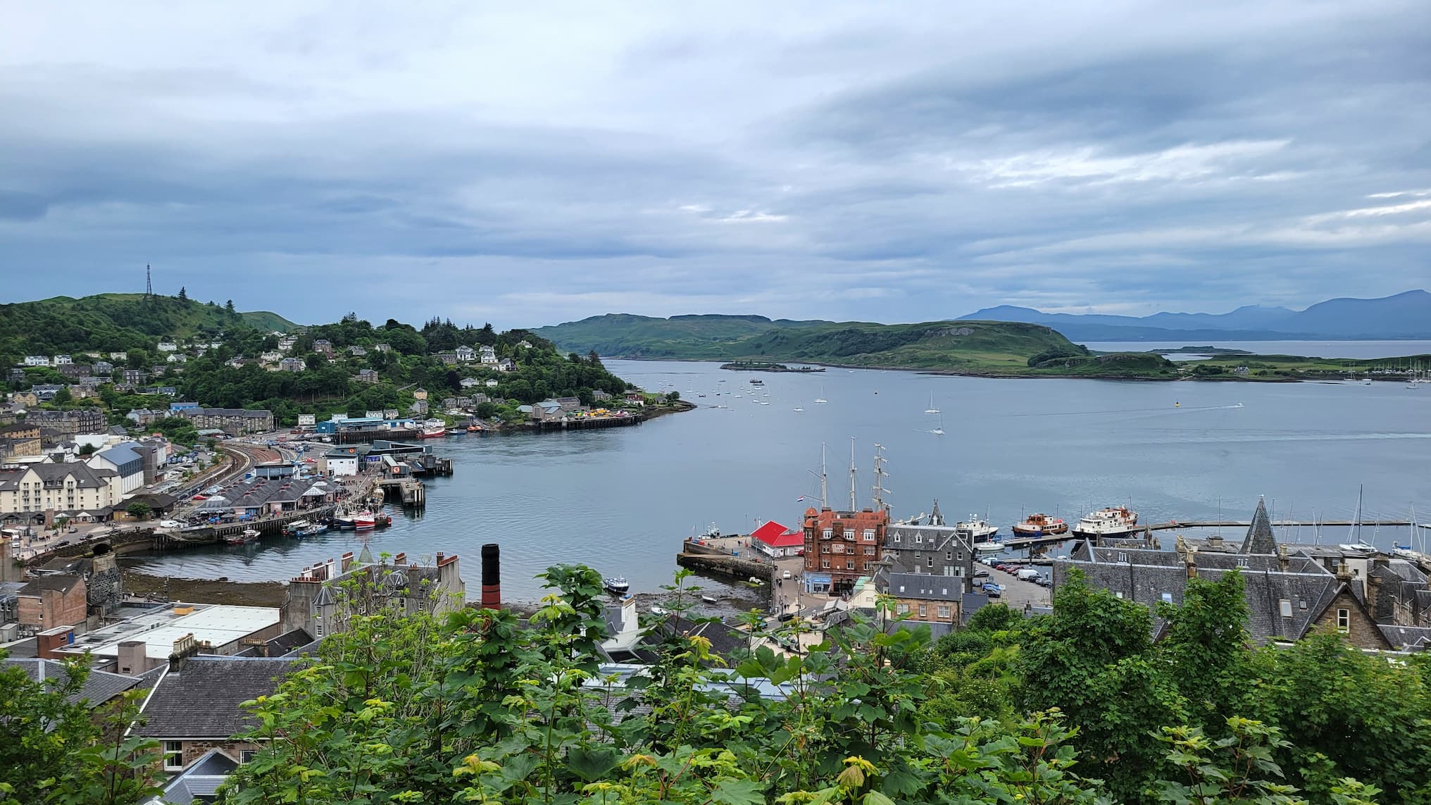Une fois en haut, la vue est sublime : panorama sur la baie d’Oban, le port, les îles au large et les toits de la ville.